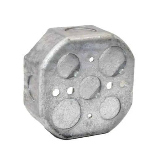 Durable steel octagon electrical box, 4″x4″x3/4″, ideal for secure wiring installations. Precision-engineered for safety and reliability.